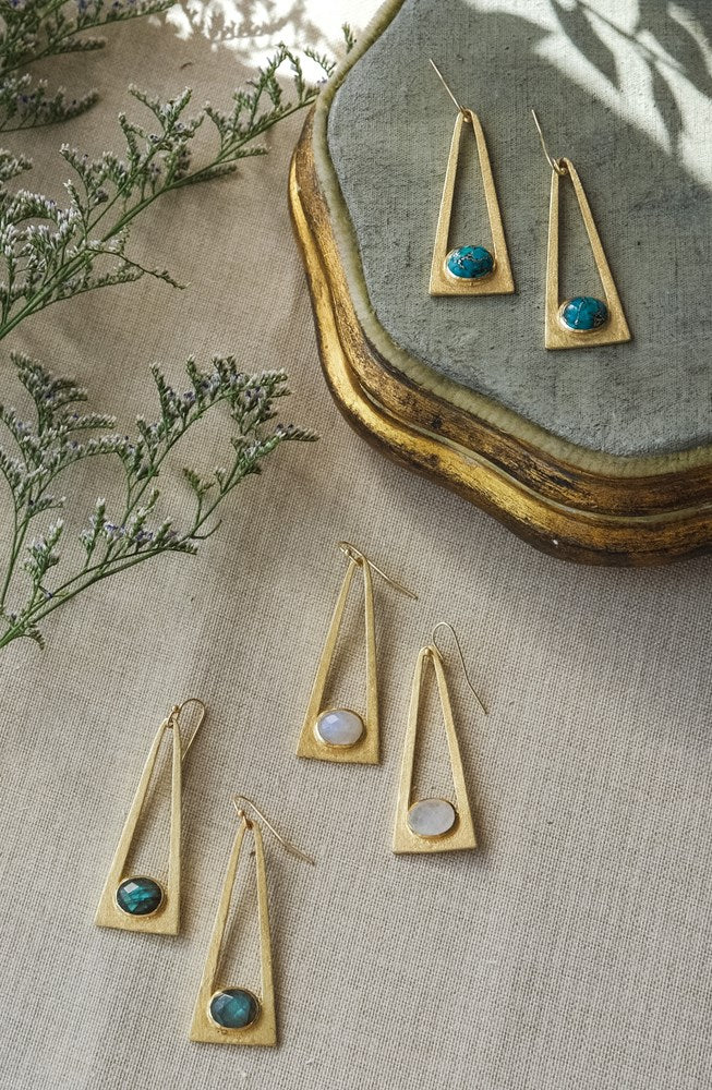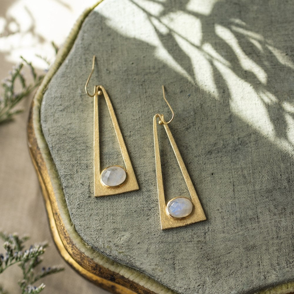 The earrings are approximately 2.25" long and made with natural moonstone.