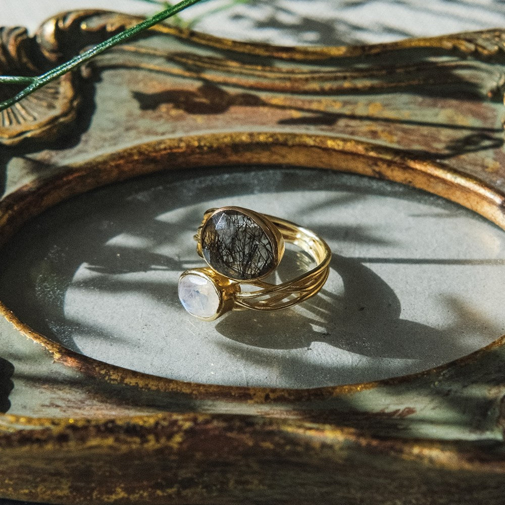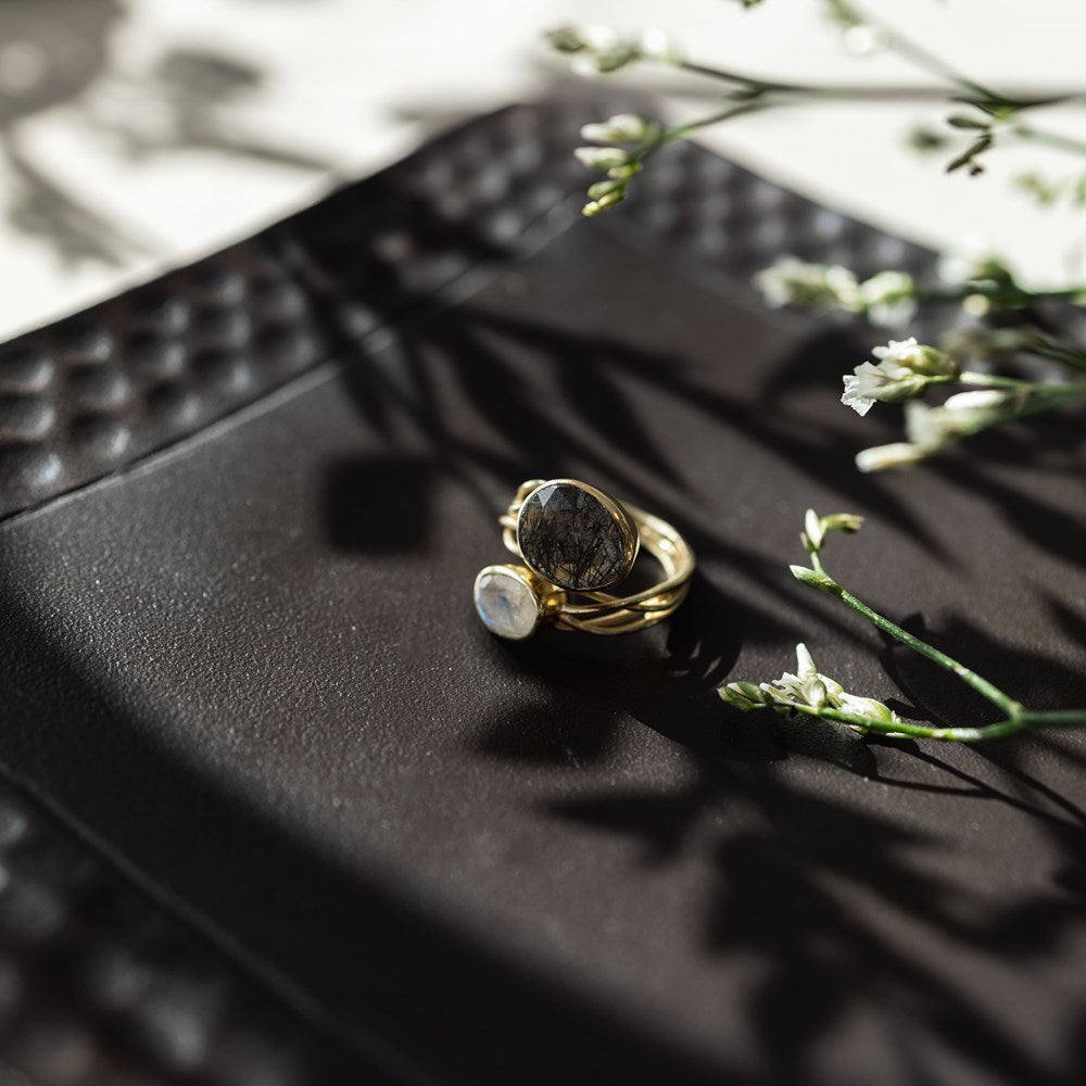 Shruti Ring-tourmalinated quartz, rainbow moonstone