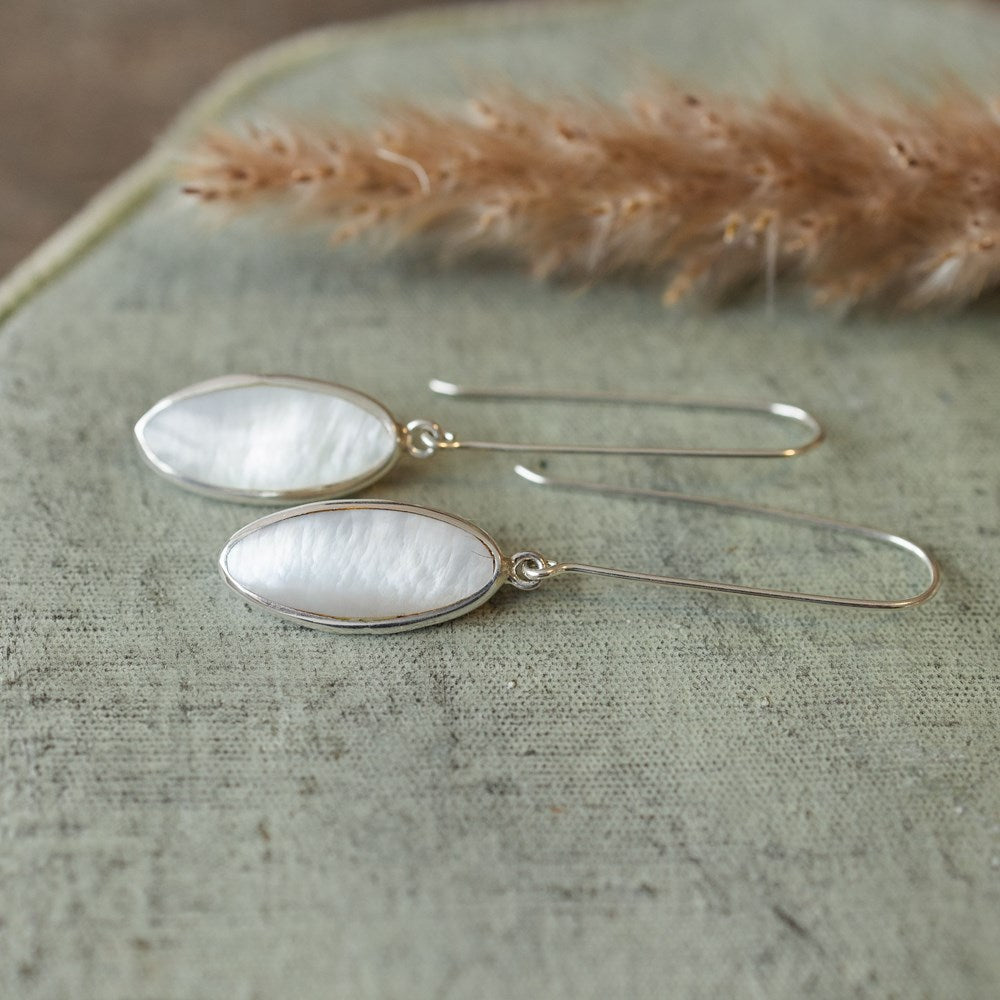 The earrings are approximately 2.25" long. Made with natural mother of pearl.