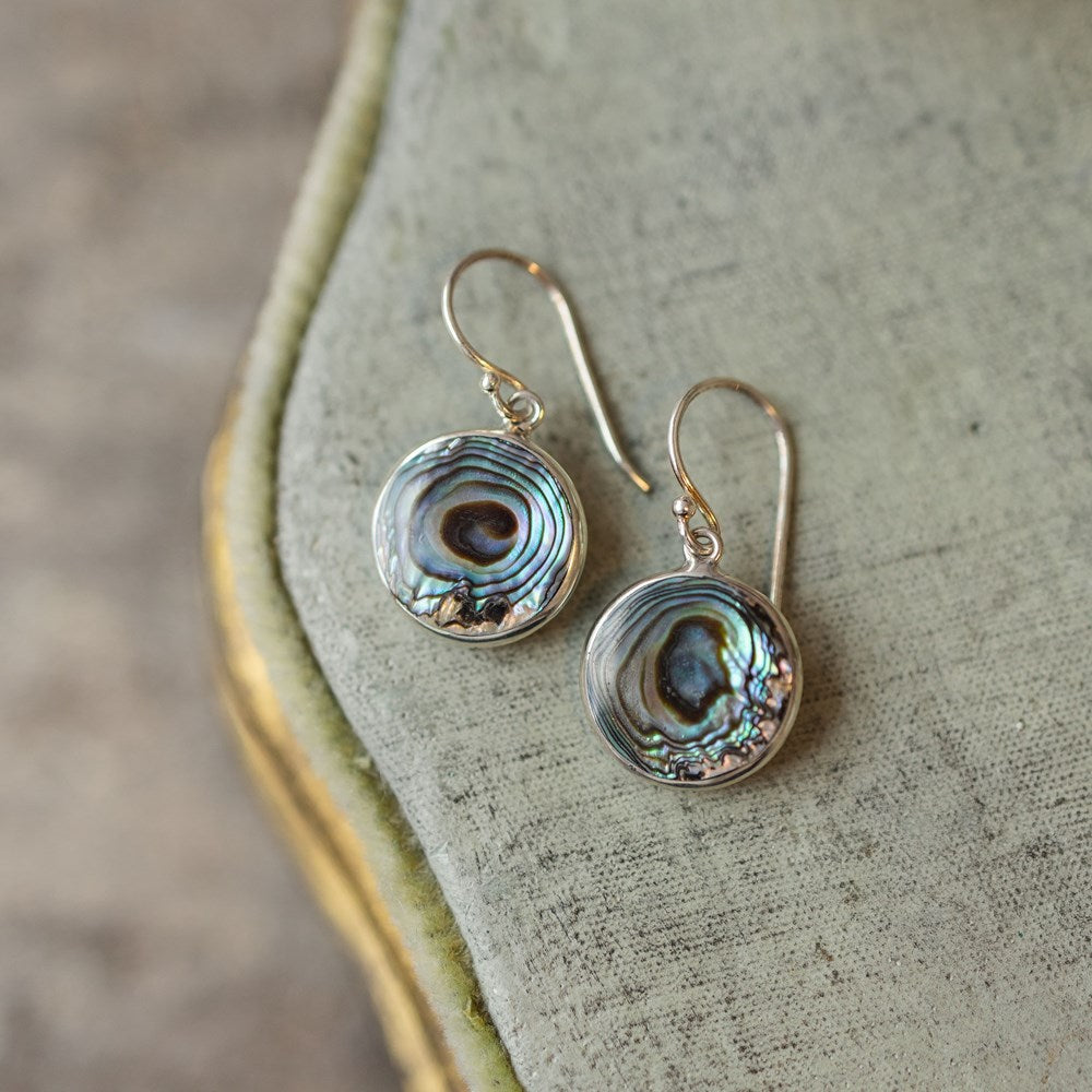 The earrings are approximately 1.25" long. Featuring natural abalone.